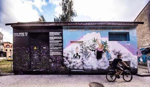 Kanapių kultūros dienai skirtas interaktyvus gatvės meno kūrinys, kvietęs praeivius pasirašyti už kanabinoidų legalizavimą.
